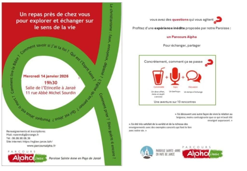 C’est pourquoi la paroisse propose une expérience inédite dans un Parcours Alpha, pour échanger avec d’autres sur ce qui vous anime. Que ce soient sur les questions essentielles de la vie, la recherche de sens, en famille, en couple, entre amis : faites une pause